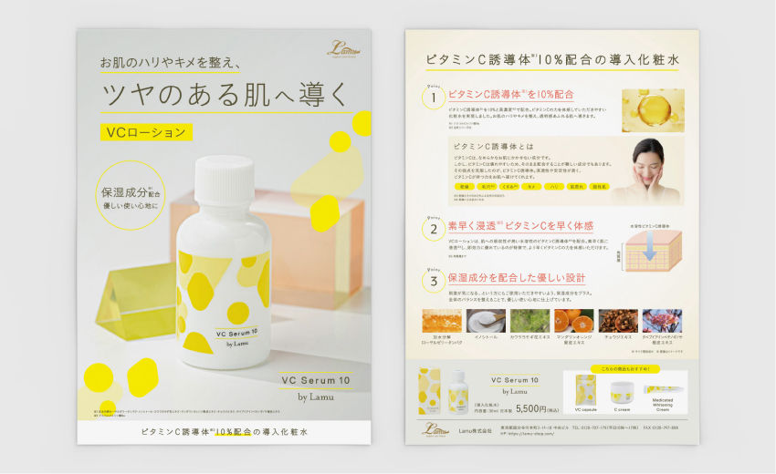 2年ほど前のVC配合保湿クリームのデザインを皮切りに、順を追って4製品のパッケージデザインを手がけ、VCシリーズとしてまとました。お客様の方で当初から順次展開するイメージはあったため、デザイン時に異なる形のパッケージにも展開しやすいよう構成していたのが奏功し、結果としてブランディング施策のようになりました。ビタミンCの効能を感じさせるデザインに仕上がっています。