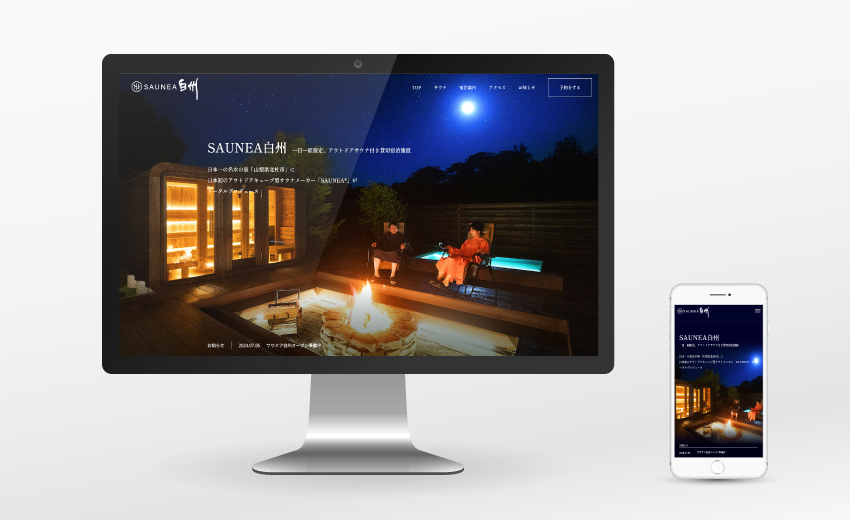 サウナメーカーが手掛ける宿泊施設のWebサイトを制作しました。サウナファーストという独自の価値観をビジュアル化するため、スチール・ムービー含め3日間の撮影を実施。モデルのキャスティングや小物のスタイリングに至るまでトータルで担当しています。シンプルなレイアウトでスタイリッシュながら伝わりの良いWebサイトに仕上がっています。