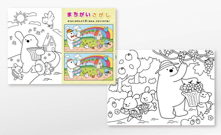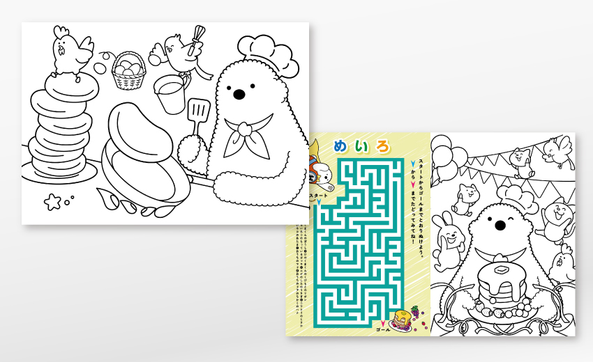 大手ハウスメーカーのノベルティとして塗り絵の制作に携わりました。既存のキャラクターを使うことのみが条件だったため、そこからストーリーを膨らませていき、森の仲間たちと楽しくパーティーを開くシーンを8Pにわたってイラスト制作。間違い探しや迷路といったページも設け、満足度の高いノベルティになりました。
