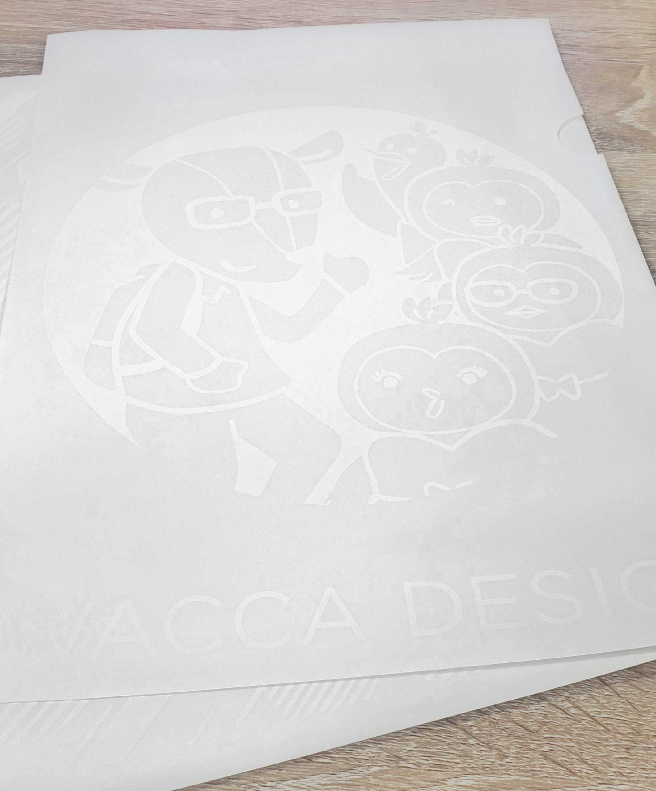 その名も「紙製ファイル」です!そもそもの開発のきっかけは、ワッカデザインに遊びに来た印刷会社さんと話していて閃いたもの。上がトレーシングペーパーで中身が透けて見え、下は上質紙を使うことでたわまないようになっています。そしてデザイン部分は白インクのみで印刷してみたら、何とも言えない不思議な仕上がりに!試しに作ったサンプルを使って見積の提示や配布資料を入れて渡すとお客様からの反応もかなり大きく、これは思っていたより良いな、という感触を受け、この度社内でのクリアファイルの代替として本格導入することを決めたと同時に、製品化することにしました。