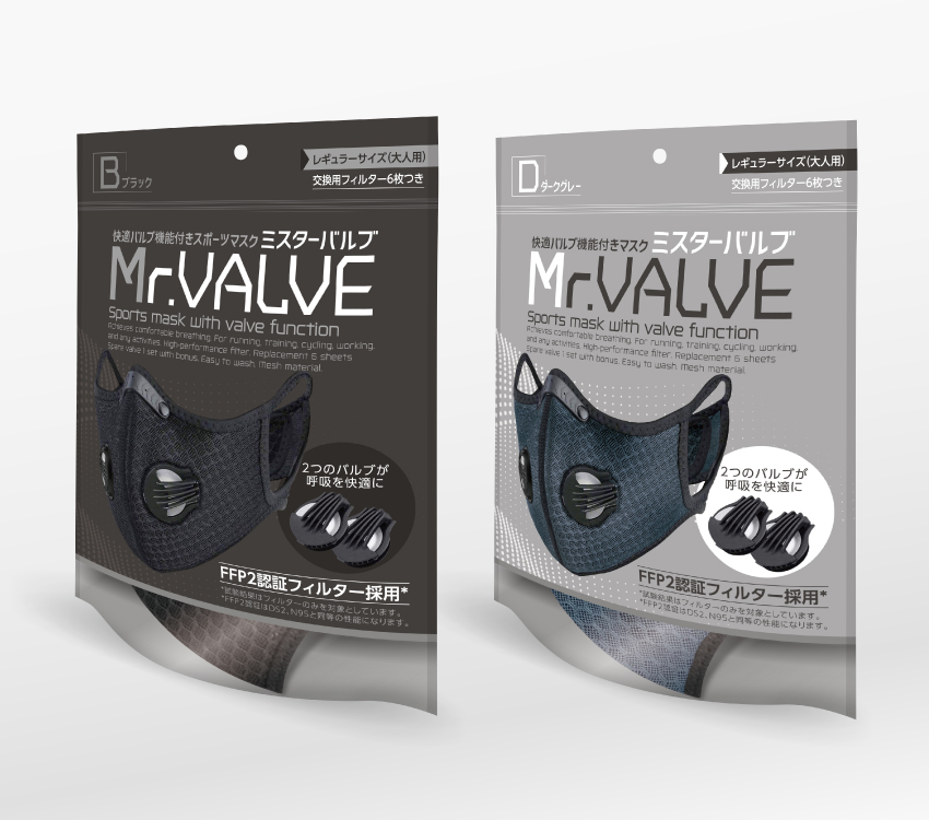 オリジナルで開発されたバルブ付きマスクのパッケージデザインを手がけました。コロナ禍にあってマスク需要が高い中、バルブによって呼吸を楽にすることができるマスク。テクノロジーとスマートさを感じさせることで、オリジナリティある製品の価値を訴求する狙いのデザインとなっています。